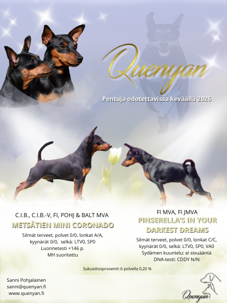Ensimmäinen japanese chin tuli meille vuonna 1995. Siitä alkoi matka rodun parissa ja se jatkuu katkeamatta edelleen. Ensimmäinen kääpiöpinseri tuli 2001 ja pinseri 2007. Nykyään lauman muodostavat chinit Hippu ja Myytti sekä kääpiöpinseri Fira ja pinseri Ria.